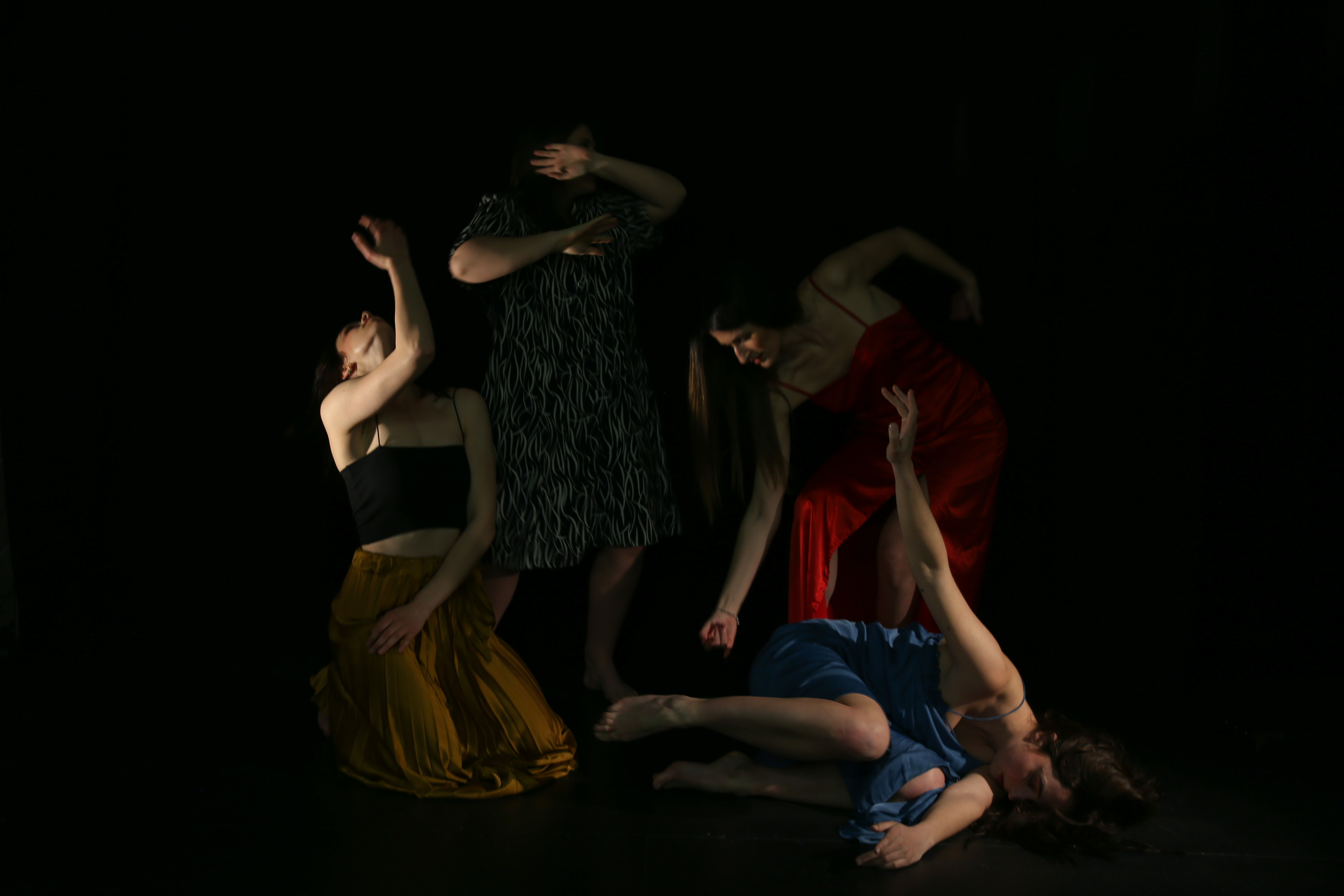 Daidat : Danse – Aida – Théâtre voit le jour en 2022, avec la rencontre entre la chorégraphe et metteuse en scène Aida Llukaj et les comédiennes-danseuses Charlotte Nivet, Léa Schwartz, Lorette Ducornoy. Le moyen d’expression, la danse-théâtre , s’inspire du travail de la chorégraphe allemande Pina Bausch dont l’humain est représenté dans toute sa complexité. On vient creuser dans l’intimité des comédiens/danseurs pour en extraire un mouvement, une idée, un solo, un duo ou une scène collective. Dans la danse-théâtre, l’artiste- interprète est acteur et danseur à la fois et le style chorégraphique utilisé est celui de la danse contemporaine. Nous passons de la danse au théâtre de façon naturelle, exactement comme dans la vie de tous les jours où chaque individu s’exprime avec sa voix et complète avec des gestes lorsque la parole n’est pas assez puissante ou défaillante, et inversement. Nous partons de faits quotidiens et nous les théâtralisons. Les improvisations sont retravaillées afin d’étirer les situations jusqu’à leur paroxysme. L’idée est de plonger le spectateur dans des microcosmes éphémères, mélangeant le concret de la vie et son absurdité, dans une bulle presque onirique. Ainsi, la scène se fait révélatrice d’une réalité prise sous différents angles.